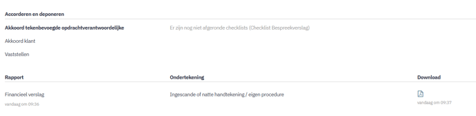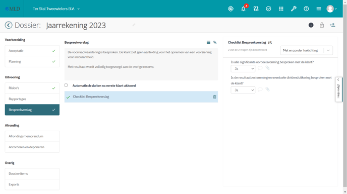 Wanneer een checklist bij het bespreekverslag volledig is ingevuld, verschijnt er een vinkje op het tabblad van het bespreekverslag. De checklist dient volledig te zijn ingevuld voordat de opdrachtverantwoordelijke zijn akkoord kan geven.